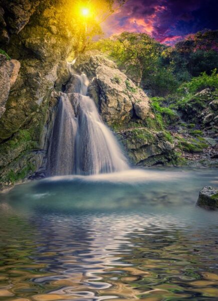 Das Bild zeigt einen majestätischen Wasserfall, der von üppigem grünen Dschungel umgeben ist. Das klare Wasser stürzt sich in einen glitzernden Pool, während exotische Pflanzen und farbenfrohe Blumen die Szene umgeben. Die lebendigen Farben und die feinen Details lassen das Bild lebendig wirken und schaffen eine entspannende und beruhigende Atmosphäre.