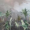 Eine Dschungeltapete in Beigetönen. Das Gemälde zeigt üppige Pflanzen, Lianen, Farne sowie exotische Vögel und Tiere. Das Ganze spiegelt die Atmosphäre wilder und exotischer Natur wider und schafft eine außergewöhnliche Kulisse, die sich perfekt für die Inneneinrichtung im tropischen Stil eignet.