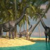 Eine Fototapete auf dunklem Hintergrund, die elegante, große Blätter und tropische Blumen in gedämpften Farbtönen sowie zwei kleine fliegende Vögel zeigt. Die Komposition hat eine künstlerische, ruhige Qualität und kombiniert Elemente der Natur mit einer raffinierten Farbpalette.