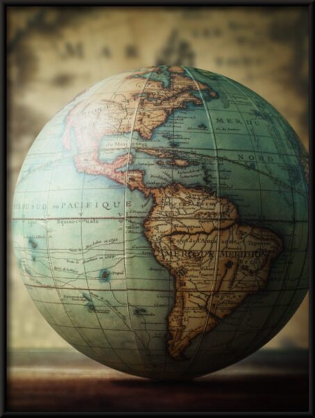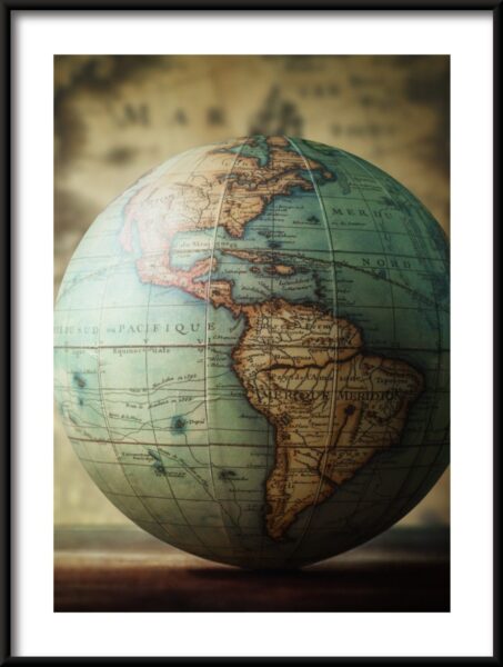 Dieses hochwertige Poster zeigt eine detaillierte Darstellung des amerikanischen Kontinents auf einem stilvollen Globus. Die lebendigen Farben und die präzisen Details machen dieses Kunstwerk zu einem Blickfang in jedem Raum.