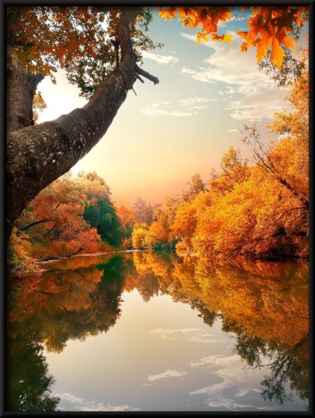 • Herbstmotiv mit Fluss und bunten Bäumen