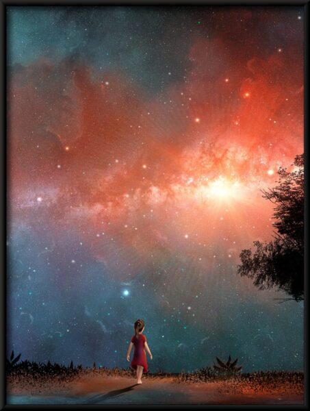 Entdecken Sie die atemberaubende Fototapete „Poster Girl unter den Sternen“ und verwandeln Sie Ihr Zuhause in eine traumhafte Oase der Ruhe und Entspannung. Dieses einzigartige Design zeigt eine elegante Frau, die unter einem funkelnden Sternenhimmel steht.