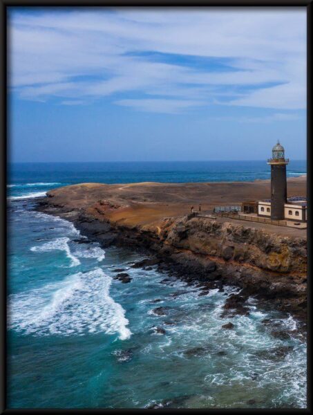 Das Poster zeigt einen majestätischen Leuchtturm, der auf einer felsigen Klippe steht und von den tosenden Wellen des Ozeans umgeben ist. Der klare blaue Himmel und das leuchtende Licht des Leuchtturms erzeugen eine beruhigende Atmosphäre und geben Ihrem Raum eine entspannende Note.