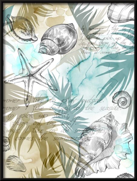 Dieses wunderschöne Poster mit Muscheln und Blättern bringt eine frische Brise in jeden Raum. Die sanften Farben und die detailreichen Illustrationen schaffen eine ruhige und entspannte Atmosphäre, perfekt für Ihr Zuhause oder Büro.