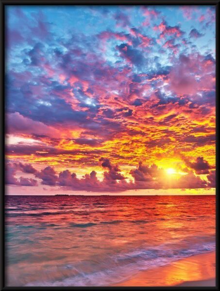 Bringen Sie mit unserem Poster „Sonnenuntergang auf den Malediven“ ein Stück Urlaubsfeeling in Ihr Zuhause und genießen Sie jeden Tag die Schönheit der Malediven!